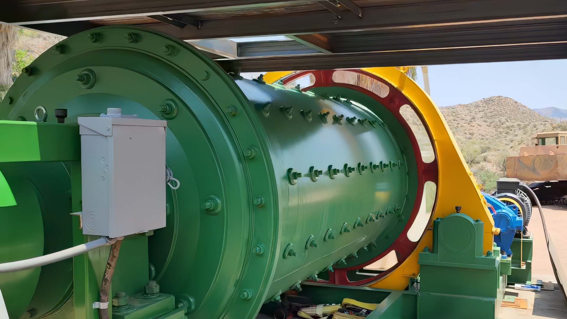 Installed processing equipment (ball mill, crusher, conveyors, shaker table) and site utilities.
